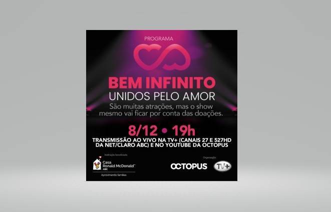 A programação vai contar com diversos artistas, personalidades, sorteios de brindes, leilão e muito mais. Será dia 8/12, às 19h, ao vivo pela TV+ (27 e 527HD NET ABC) e pelo Youtube da Octopus Comunicação.