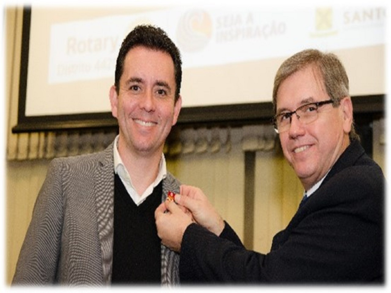 Carlos Torci entregou ao Prefeito Paulo Serra o distintivo da campanha End Polio Now do Rotary Internacional.
